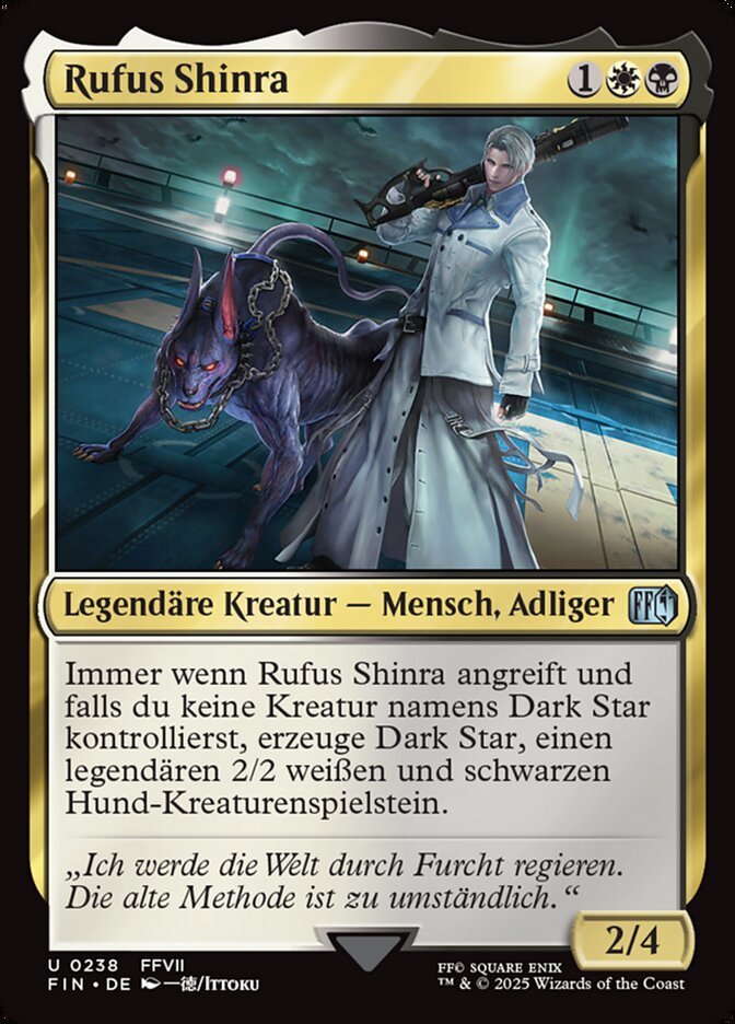 Immer wenn Rufus Shinra angreift und falls du keine Kreatur namens Dark Star kontrollierst, erzeuge Dark Star, einen legendären 2/2 weißen und schwarzen Hund-Kreaturenspielstein.