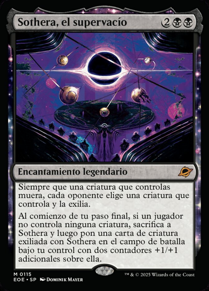 At the beginning of your end step, if a player controls no creatures, sacrifice Sothera, then put a creature card exiled with it onto the battlefield under your control with two additional +1/+1 counters on it.