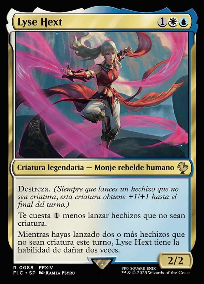 Mientras hayas lanzado dos o más hechizos que no sean criatura este turno, Lyse Hext tiene la habilidad de dañar dos veces.