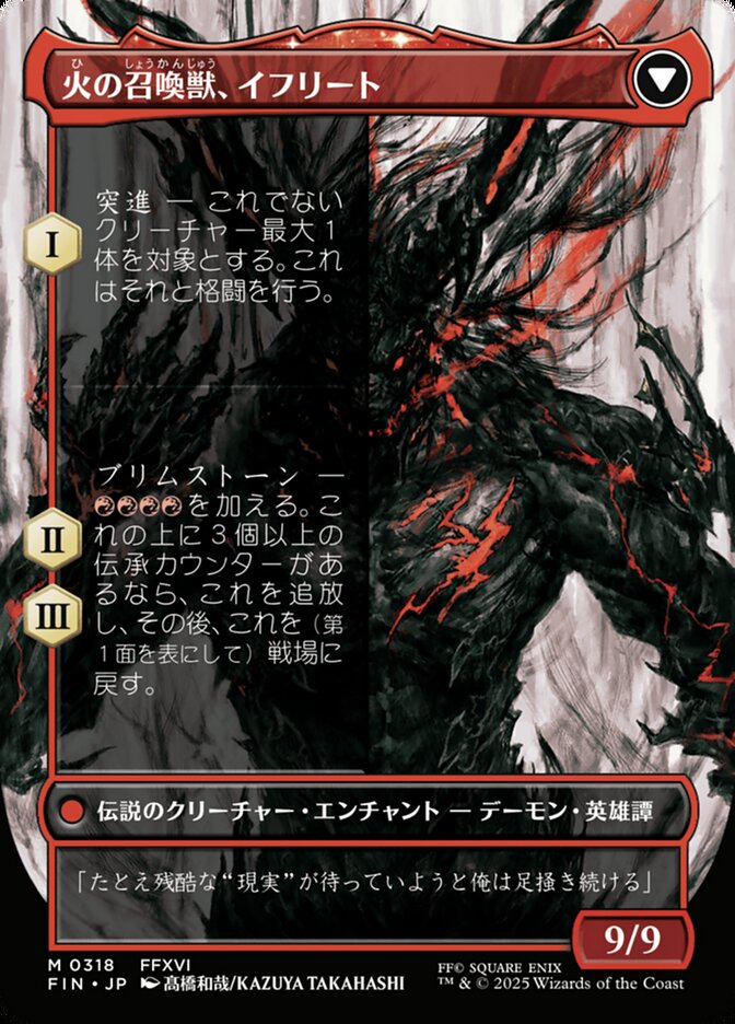 II, III — ブリムストーン ―{R}{R}{R}{R}を加える。これの上に3個以上の伝承カウンターがあるなら、これを追放し、その後、これを(第1面を表にして)戦場に戻す。