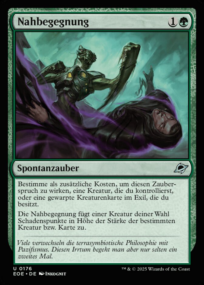 Close Encounter deals damage equal to the power of the chosen creature or card to target creature.