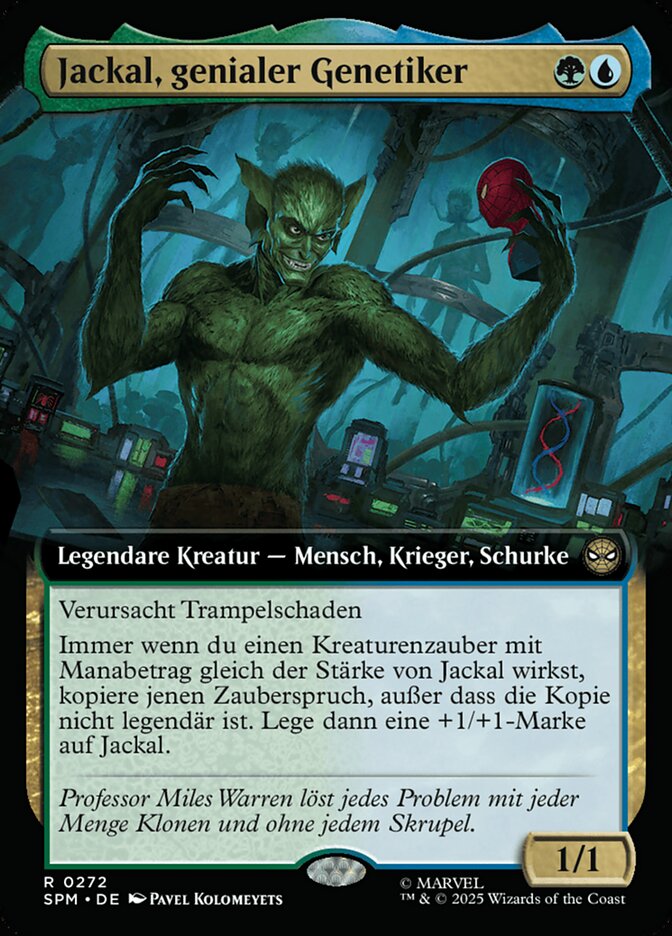 Immer wenn du einen Kreaturenzauber mit Manabetrag gleich der Stärke von Jackal wirkst, kopiere jenen Zauberspruch, außer dass die Kopie nicht legendär ist. Lege dann eine +1/+1-Marke auf Jackal.