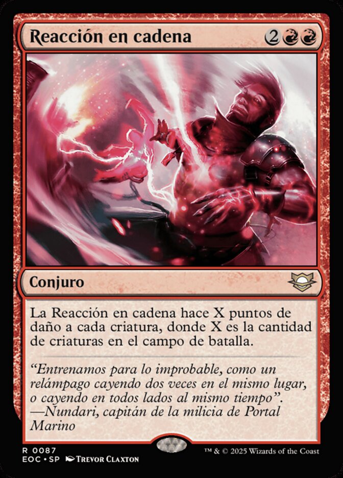 Chain Reaction deals X damage to each creature, where X is the number of creatures on the battlefield.
